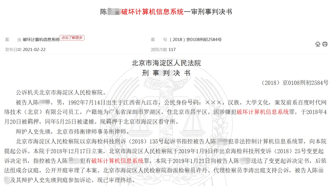 据案件显示,在百度时代网络技术(北京)有限公司担任研发工程师的陈某,出生于1992年,利用其职务之便,超越权限,通过篡改数据、编写脚本等方式,违规通过了735个媒体网站账号加入“百度联盟”的申请,致使公司374万元广告分成遭到损害。
