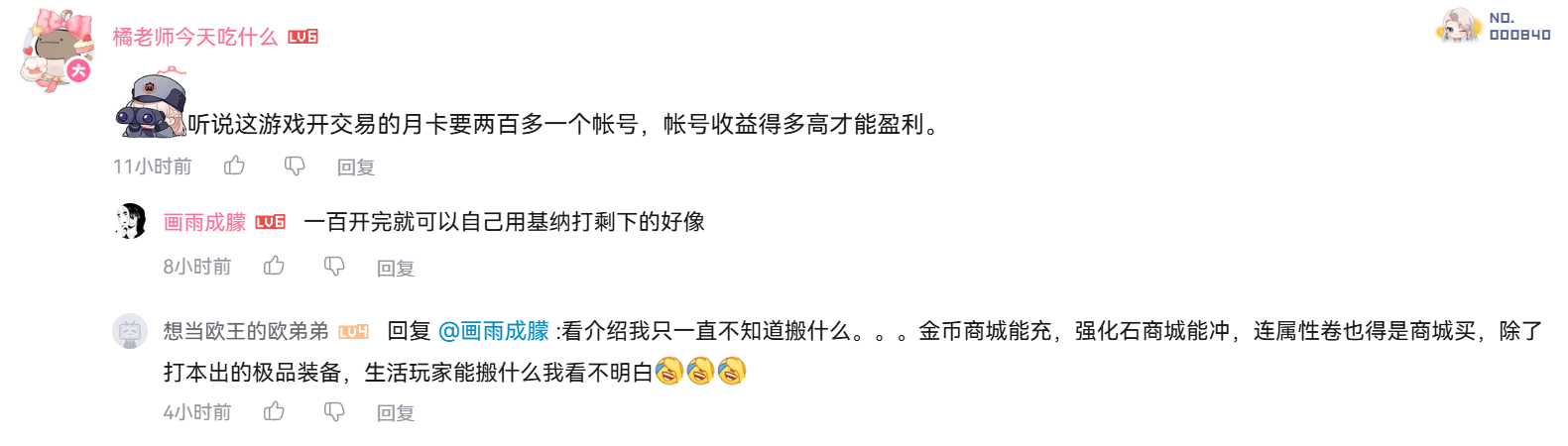 除了会员权益之外,战令系统也是必买的。因为官方塞了大量养成材料在里面,再算上外服VPN,一个月玩家至少要交400到500块,才能进入游戏,而且不一定能正常赚到钱,因为玩家们能打的金币商城能充,强化石商城能冲,连属性卷也得是商城买,除了打本出的极品装备,生活玩家能搬出什么,根本看不出来。