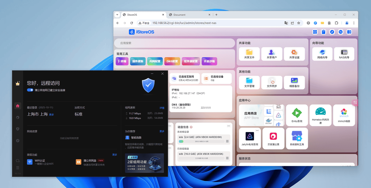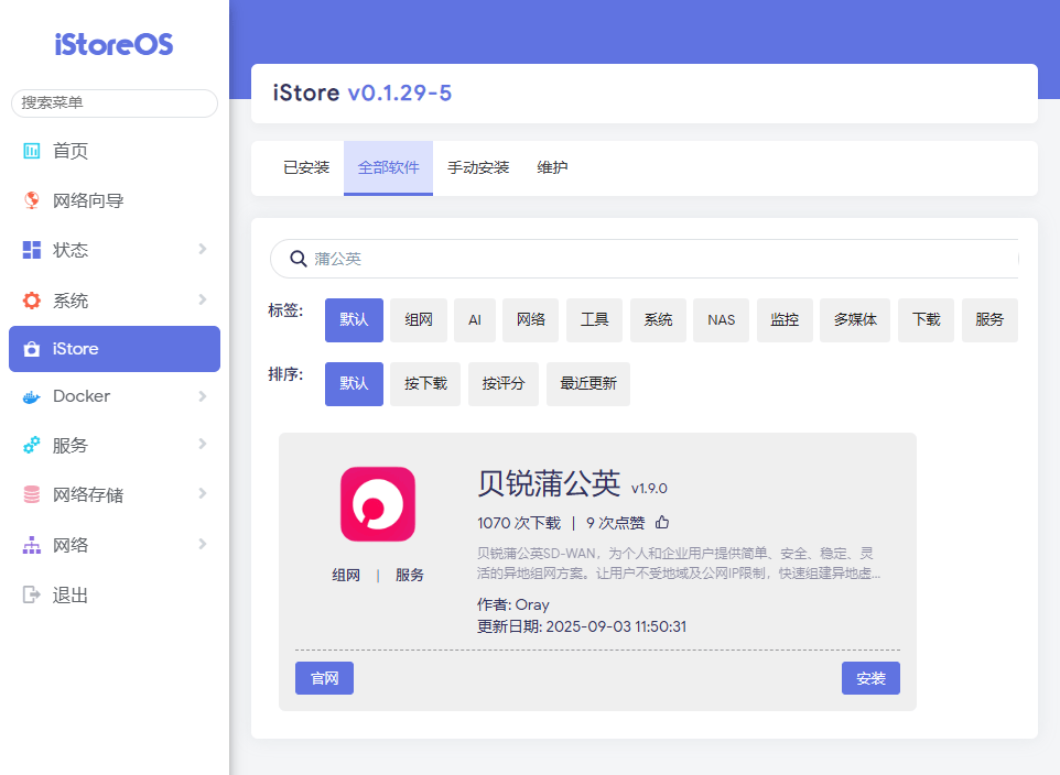 而现在,得益于贝锐蒲公英与iStoreOS的深度集成,流程被极度简化。用户无需再进行复杂的路由映射或申请公网IP,只需在iStoreOS应用中心安装“贝锐蒲公英”并登录账号,配合手机、电脑端的蒲公英客户端,即可快速建立异地虚拟局域网。