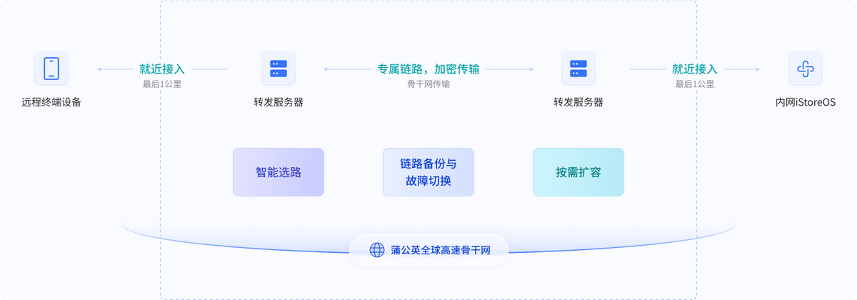 此外,贝锐蒲公英方案更拥有强大的P2P直连技术与全球智能链路。在iStoreOS场景下,蒲公英能最大化利用双方网络带宽,实现P2P高速直连;即便在跨运营商、跨地区的复杂网络环境下,也能智能优选传输路径,确保低延时、高稳定的传输体验。