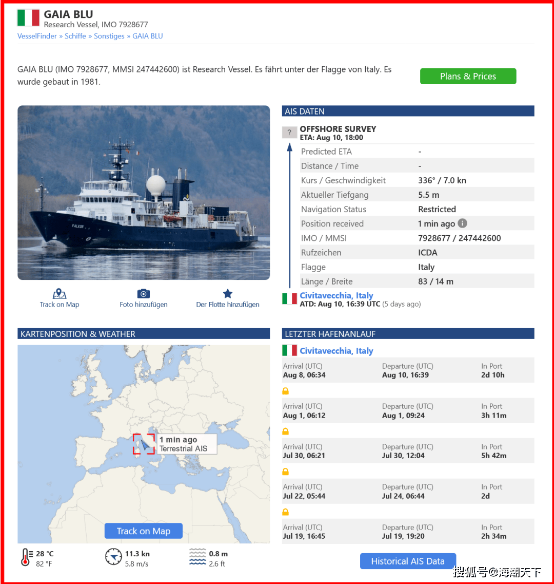 这艘“福尔科尔”海洋科研船(后来有新名字叫GAIA BLU)。上图是2024年8月15日它的位置,可以在网上查到的。图片来源:vessel finder