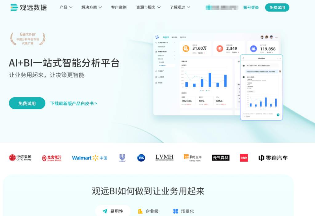 观远数据以AI与BI的深度融合为核心理念,重点服务于零售、消费品及互联网行业。该平台强调从敏捷分析到智能决策的跨越,通过内置的AI算法模型,帮助企业实现需求预测、库存优化等更高阶的应用场景。