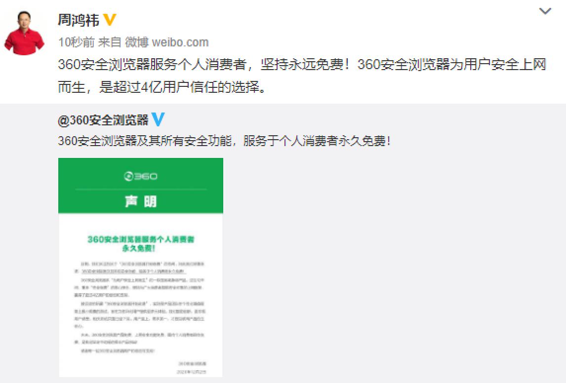 随后,360集团董事长兼CEO周鸿祎也转发该声明称:360安全浏览器服务个人消费者,坚持永远免费。